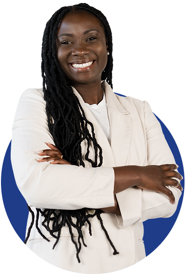 Enyah Abadjivor, founder of The Volta Co. A smiling woman with long dreadlocks, wearing a white blazer and white top, standing with crossed arms against a blue background.